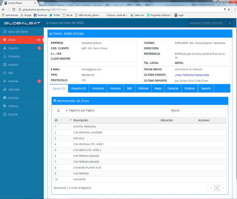 A través de www.globalsatint.com., el cliente podrá accesar al historial de su sistema de alarma, verificando activaciones y desactivaciones del sistema (aperturas y cierres), usuarios, alarmas emitidas en fecha y horas realizadas.